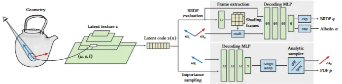 잠재 텍스처는 두 개의 네트워크로 디코딩됩니다. 평가 네트워크는 주어진 방향 쌍에 대한 BRDF 값을 추론합니다. 샘플링 네트워크는 무작위 숫자를 샘플링된 방향으로 매핑합니다.