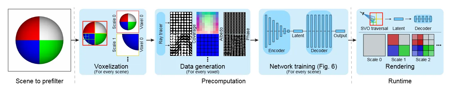 본 연구는 이러한 한계를 극복하기 위해 SVO(Sparse Voxel Octree)를 데이터 구조로 사용하는 다중 스케일 계층적 복셀(voxel) 표현을 제안합니다. 초기 오프라인 데이터 생성 단계에서는 레이 트레이서(ray tracer)로 각 복셀 내의 광 전송(light transport)을 캡처합니다. 캡처된 정보는 appearance phase function , directional coverage mask , albedo 로 인코딩된 경량 latent representation으로 변환됩니다. 런타임에는 원본 기하학, 재료, 텍스처 없이 미리 학습된 신경망 추론(inference)만으로 이 잠재 표현을 디코딩하여 장면을 렌더링합니다..