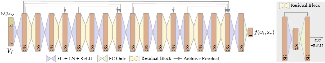 BRDF 디코더는 잠재 코드 z(x)에서 두 개의 셰이딩 프레임을 추출합니다. 입사 및 반사 방향 를 각 프레임으로 변환한 후, 변환된 방향과 를 MLP에 전달하여 BRDF 값을 예측합니다. 중요도 샘플러는 분석적 2-lobe 분포의 파라미터를 추출합니다. 이를 사용하여 나가는 방향 를 샘플링하고 PDF 를 평가합니다.
