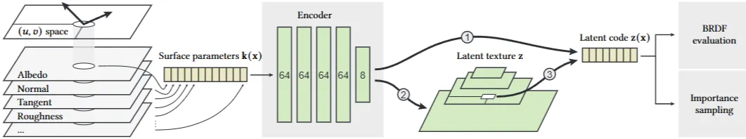 인코더는 머티리얼 파라미터 (알베도, 거칠기, 노멀 맵 등)를 입력받아 잠재 벡터 를 출력합니다. 디코더가 수렴하면 인코더를 제거하고, 모든 텍셀에 대해 인코더를 평가하여 잠재 텍스처를 초기화합니다. 이후 디코더를 통한 역전파로 잠재 텍스처를 직접 학습합니다.
