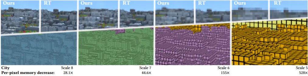 본 방법은 per-pixel memory footprint를 크게 줄입니다. City 장면에서 scale 0(가장 거친 해상도)의 경우 레이 트레이싱 대비 약 280,000배, scale 8(가장 미세한 해상도, 256×256 이미지)의 경우 약 28배의 메모리 절감 효과를 보였습니다. 렌더링 시간은 scale 5까지는 레이 트레이싱보다 빠르지만, 그 이상의 미세한 스케일에서는 네트워크 추론 비용 증가로 인해 레이 트레이싱이 더 빨라지는 변곡점이 있습니다.