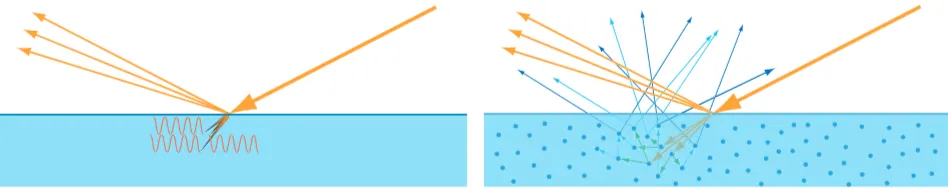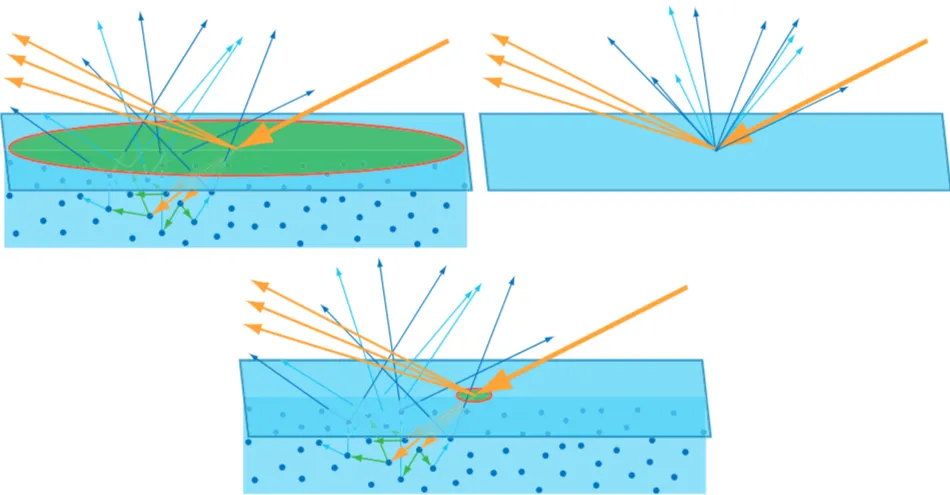 그림 21: BRDF 스페큘러 항은 일반적으로 표면 반사에 사용되며, BRDF 디퓨즈 항은 표면 하 산란에 사용됩니다.
