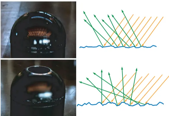 [그림 14] 윗줄: 비교적 매끄러운 표면. 표면 방향의 변화가 작아 반사광 방향의 분산이 작고, 더 선명한 반사가 나타납니다.