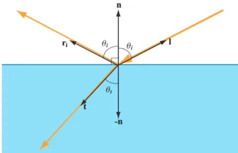 그림 12: 평면 경계에서의 굴절률 변화는 빛을 두 방향으로 산란시킵니다. (이미지 출처: "Real-Time Rendering, 3rd edition", A K Peters의 허가를 받아 사용됨.)