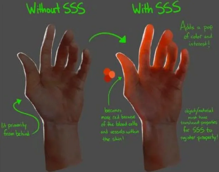 이 효과를 포착하려면 국소적인 셰이딩만으로는 충분하지 않으며 특수한 렌더링 기법을 사용해야 합니다. 이를 보통 "서브서피스 스캐터링(SSS)" 기법이라 부르지만, 중요한 점은 "일반적인" 디퓨즈(Diffuse) 셰이딩 또한 동일한 물리적 현상(굴절된 빛의 표면하 산란)의 결과라는 사실입니다.