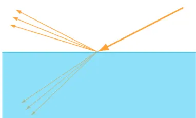 이 특수한 경우, 빛은 모든 방향으로 연속적으로 산란되는 대신 정확히 두 방향—반사(reflection)와 굴절(refraction)로 나뉩니다(그림 12).