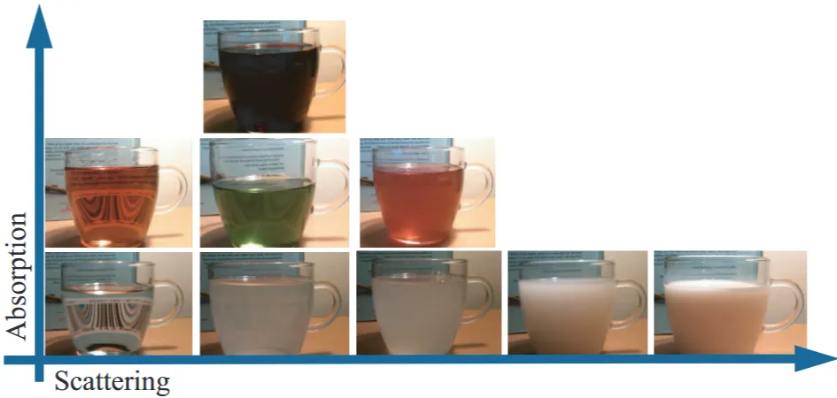 그림 11: 다양한 양의 빛 흡수와 산란을 보여주는 매질들.