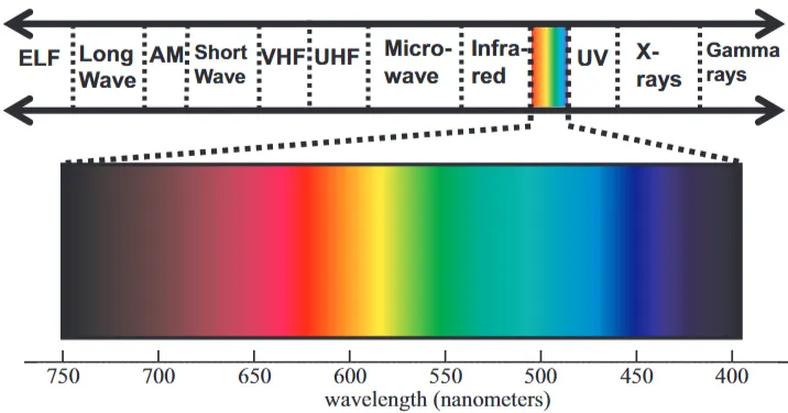 빛은 파동이므로 파장으로 특정할 수 있습니다. 전자기 파장은 매우 넓은 범위를 포괄하지만, 여기서는 인간에게 가시적인 좁은 영역만 다룹니다.