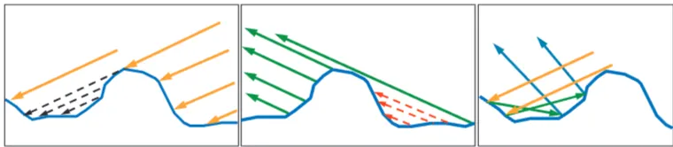 그림 23: 왼쪽에서 일부 미세면은 방향으로부터 가려져 빛을 받지 못하므로(쉐도잉, shadowing) 아무것도 반사할 수 없습니다. 중앙에서 일부 미세면은 시야 방향 에서 보이지 않으므로(마스킹, masking), 그곳에서 반사된 빛은 볼 수 없습니다. 두 경우 모두 이러한 미세면들은 BRDF에 기여하지 않습니다. 실제로는 그림자 진 빛이 단순히 사라지는 것이 아니라 미세면에서 계속 튕겨 나가며, 그중 일부는 결국 시야 방향으로 들어옵니다(오른쪽 참조). 이러한 상호 반사(interreflections)는 미세면 이론에서 무시됩니다.