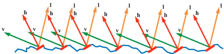 그림 22: 인 미세면들은 을 로 반사하도록 배향되어 있습니다. 다른 미세면들은 BRDF에 기여하지 않습니다.