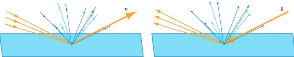 셰이딩 목적상 이러한 미세 기하학을 통계적으로 처리하고, 표면의 각 지점에서 빛이 여러 방향으로 반사(및 굴절)되는 것으로 간주하는 것이 일반적입니다(그림 15).