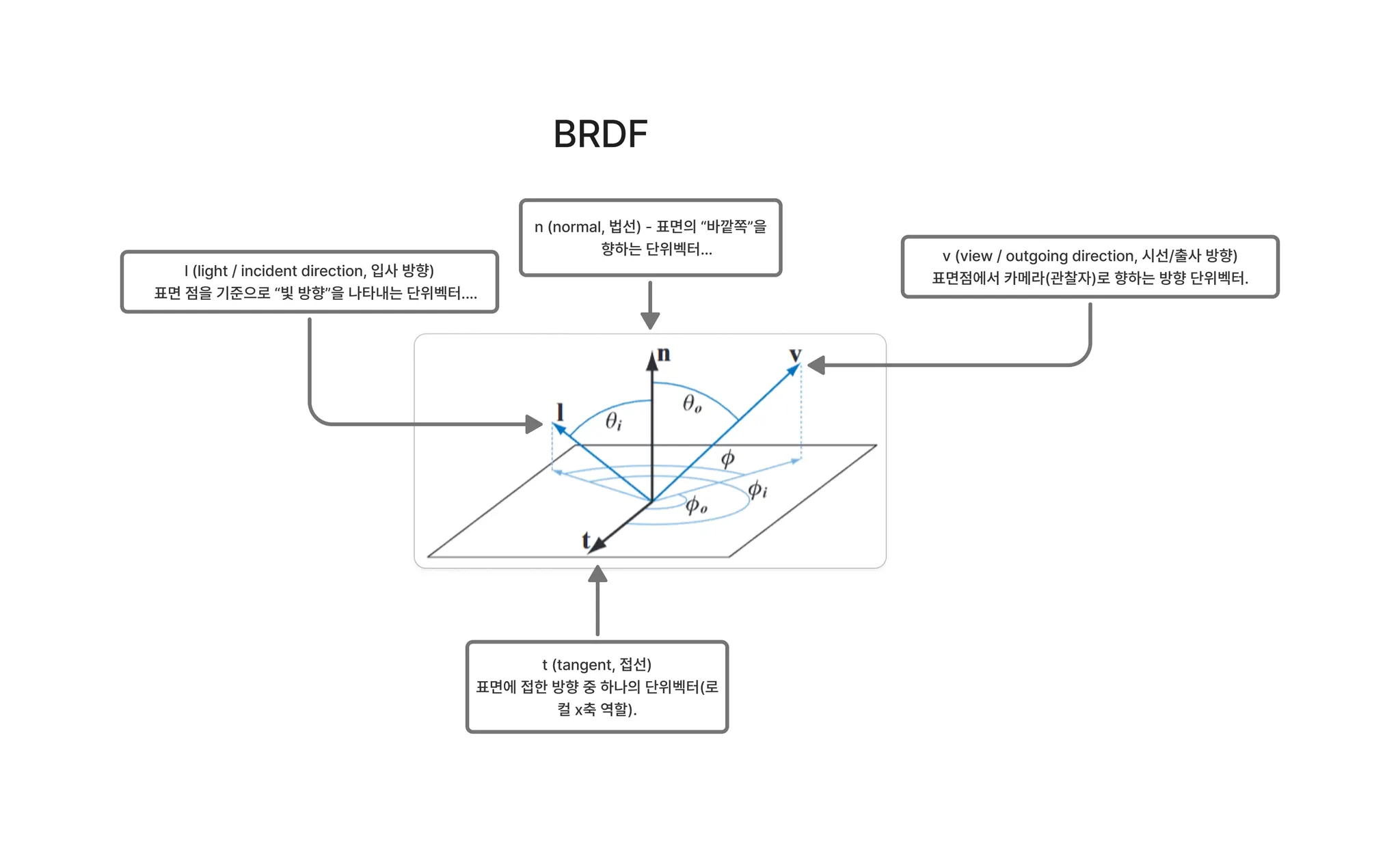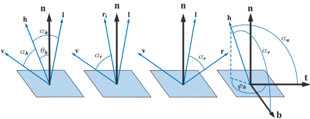 그림 18: BRDF는 들어오는 방향과 나가는 방향에 의존합니다. 이들은 네 개의 각도로 매개변수화될 수 있으며, 등방성 BRDF의 경우 세 개로 가능합니다. 여기서 은 표면 법선 벡터, 은 들어오는 빛 방향 벡터, 는 나가는(시야) 방향 벡터, 는 표면 위의 선호 방향을 정의하는 접선 벡터입니다(이는 빛과 시야 벡터가 을 중심으로 회전할 때 반사 거동이 변하는 이방성(anisotropic) BRDF에만 사용됩니다).