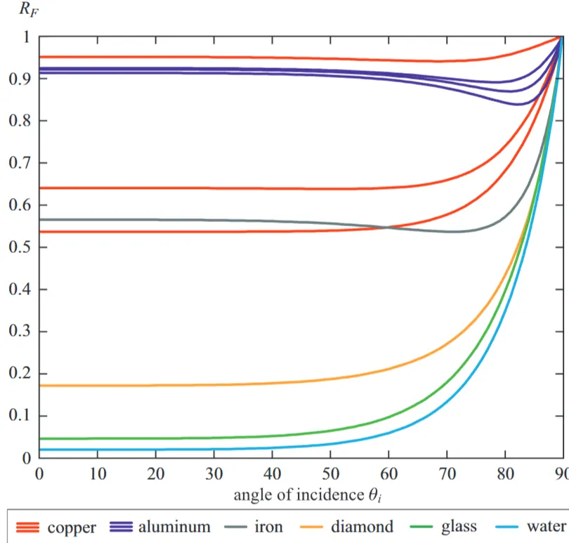 프레넬 반사율 함수는 광학적으로 평평한(optically flat) 표면에서 반사되는 빛의 비율을 계산합니다. 이 값은 두 가지 요소에 의존합니다: 입사각(빛 벡터와 표면 법선 사이의 각도)과 물질의 굴절률입니다. 굴절률은 가시광선 스펙트럼에 걸쳐 변할 수 있으므로, 프레넬 반사율은 분광(spectral) 물리량이며, 프로덕션 목적으로는 RGB 삼중값(triple)으로 표현됩니다. 표면은 들어오는 빛의 0% 미만이나 100% 이상을 반사할 수 없으므로, 각 RGB 값은 0과 1 사이의 범위에 있어야 합니다. 우리는 인 활성 미세면(active microfacets)에만 관심이 있으므로, 프레넬 반사율에 대한 실제 입사각은 과 사이의 각도입니다.