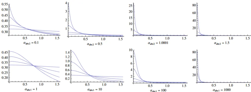 그림 32: 다양한 매개변수 값을 가진 정규화된 ABC NDF. 윗줄의 각 플롯은 (B) 매개변수를 (1에서 1000까지) 변화시킵니다 ( (C) 값은 일정하게 유지). 아랫줄의 각 플롯은 (C) 매개변수를 (0.1에서 1.5까지) 변화시킵니다 ( (B) 값은 일정하게 유지). 이 플롯에서 사용된 매개변수 값의 범위는 Löw 등 [42]에 의해 피팅된 Matusik 데이터셋 재질의 대부분을 커버합니다.