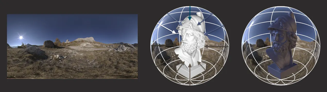 이론적으로 환경 맵은 물체 근처 지점에서 본 장면(반사하는 물체 제외)을 나타내며, 반사하는 물체가 볼록하고 반사된 장면에서 멀리 떨어져 있는 경우에만 물체의 반사에 사용할 수 있습니다. 실제 환경에서는 이러한 가정이 자주 깨집니다. 볼록하지 않은 물체는 환경을 스스로 가려야 합니다. 이는 무시되거나(게임에서 흔함), AO(Ambient Occlusion) [24]와 같은 간단한 차폐 항으로 근사되거나, 물체의 일부 표현에 대해 광선을 추적하여 더 정확하게 모델링될 수 있습니다 [48, 56].