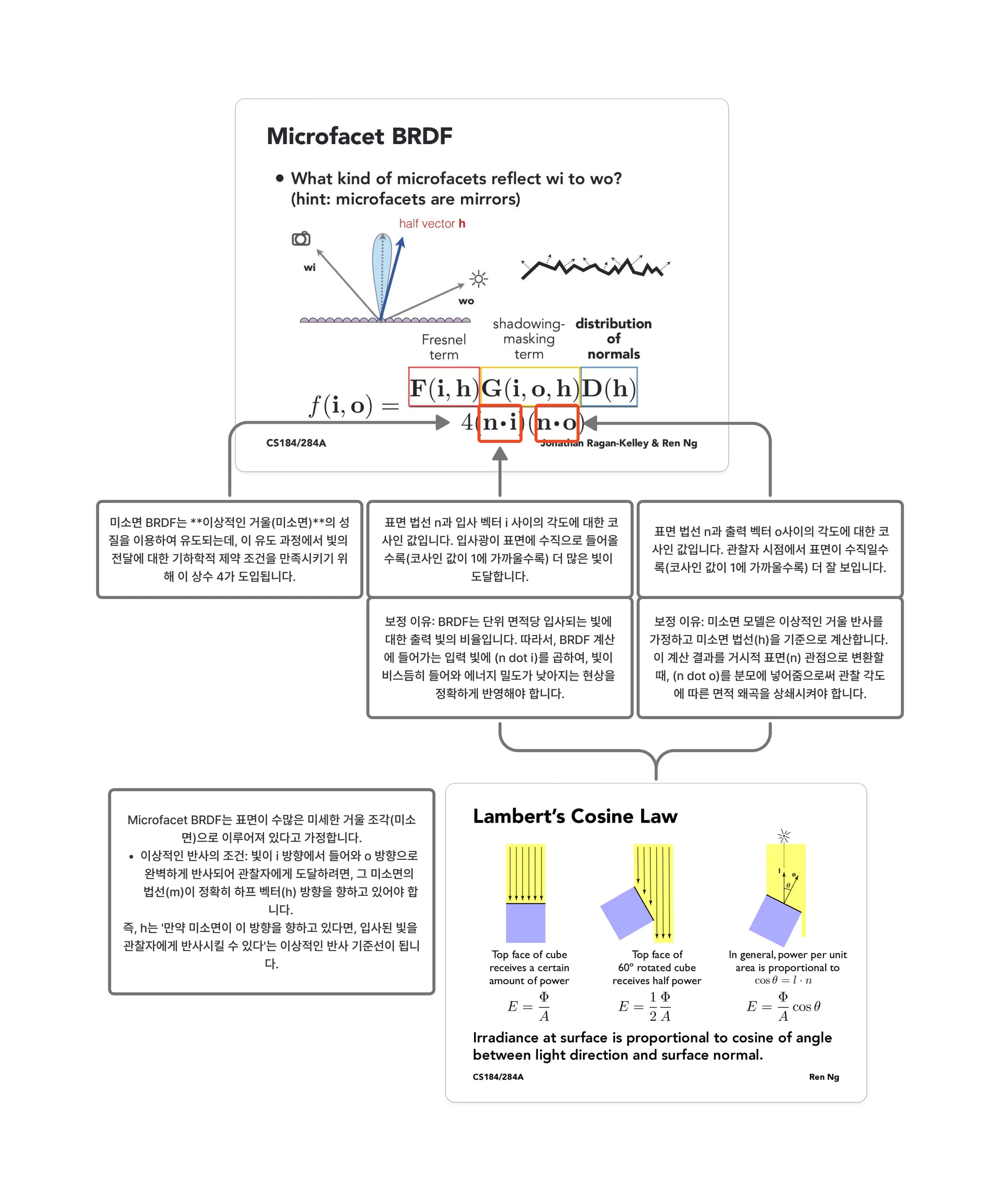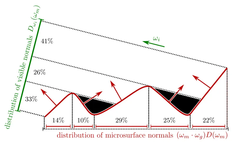 따라서 와 의 곱은 활성 미세면(active microfacets)의 밀도를 제공합니다. 이는 빛을 에서 로 성공적으로 반사하여 반사율에 실제로 기여하는 미세면들입니다.