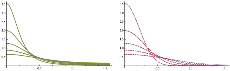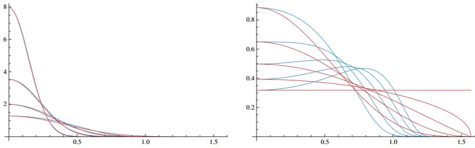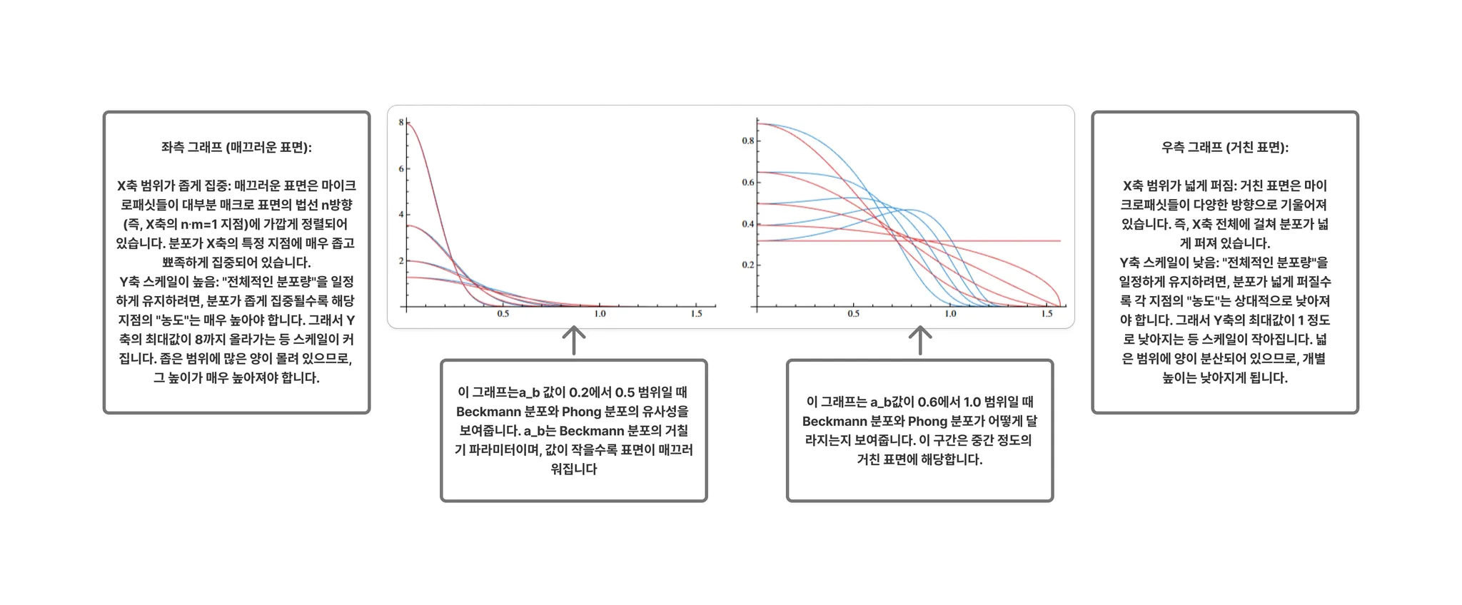 그림 28: 베크만(파란색)과 퐁(빨간색) 분포의 비교. 왼쪽: 매끄러운 표면( 범위 0.2~0.5)에서는 둘이 매우 유사함을 볼 수 있음. 오른쪽: 중간 정도로 거친 표면( 범위 0.6~1.0)에서는 다소 차이가 벌어짐을 볼 수 있음.