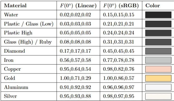 그림 24: 다양한 물질의 외부 반사에 대한 프레넬 반사율. 구리와 알루미늄은 가시광선 스펙트럼에서 반사율의 변화가 크기 때문에, 이들의 반사율은 R, G, B에 대해 세 개의 별도 곡선으로 표시됩니다. 구리의 R 곡선이 가장 높고, 그다음이 G, 마지막이 B입니다(따라서 붉은색을 띱니다). 알루미늄의 B 곡선이 가장 높고, 그다음이 G, 마지막이 R입니다. (이미지 출처: "Real-Time Rendering, 3rd edition", A K Peters의 허가를 받아 사용됨)