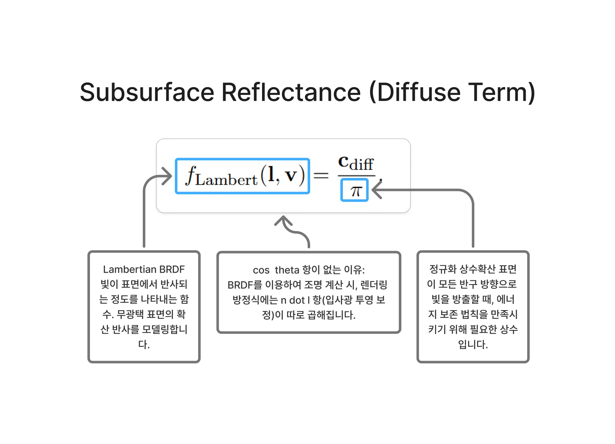 BRDF에 의해 기술되는 현상은 (적어도 비금속의 경우) 두 가지 뚜렷한 물리적 현상, 즉 표면 반사(surface reflection)와 표면 하 산란(subsurface scattering)을 포함합니다. 각 현상은 서로 다른 거동을 가지므로, BRDF는 일반적으로 각각에 대한 별도의 항을 포함합니다. 표면 반사를 설명하는 BRDF 항은 스페큘러 항(specular term)이라 불리며, 표면 하 산란을 설명하는 항은 디퓨즈 항(diffuse term)이라 불립니다. 그림 21을 참조하십시오.