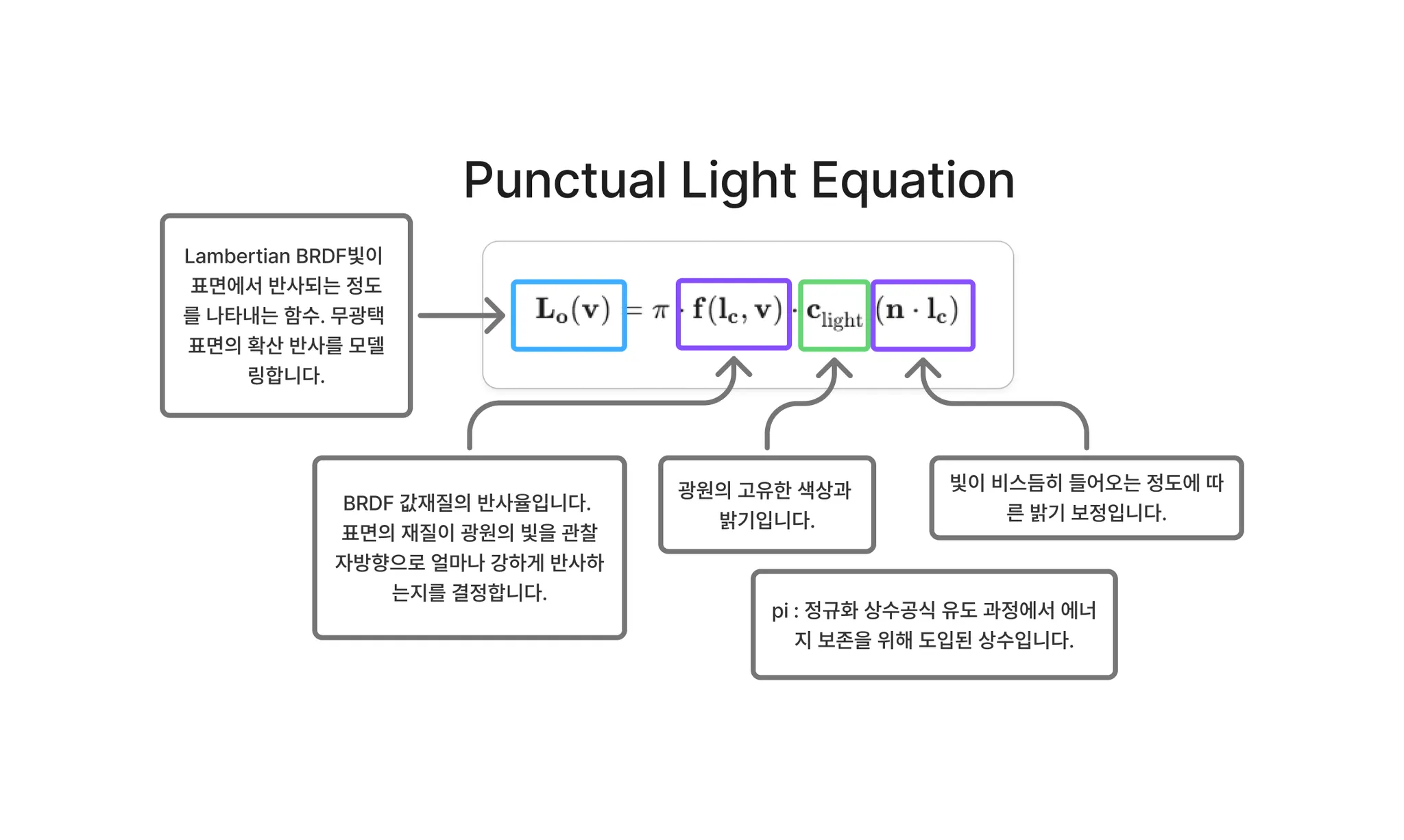 점 광원은 조명 색상 와 조명 방향 벡터 로 매개변수화됩니다. 아티스트의 편의를 위해, 는 조명 강도의 직접적인 방사 측정치(radiometric measure)에 해당하지 않습니다; 대신 이는 흰색 램버트(Lambertian) 표면이 표면 법선과 평행한 방향()에서 조명을 받았을 때 갖게 될 색상으로 지정됩니다. 우리가 보았던 다른 색상 물리량과 마찬가지로, 는 분광(RGB) 값을 갖지만, 그들과 달리 범위에 제한이 없습니다(unbounded).