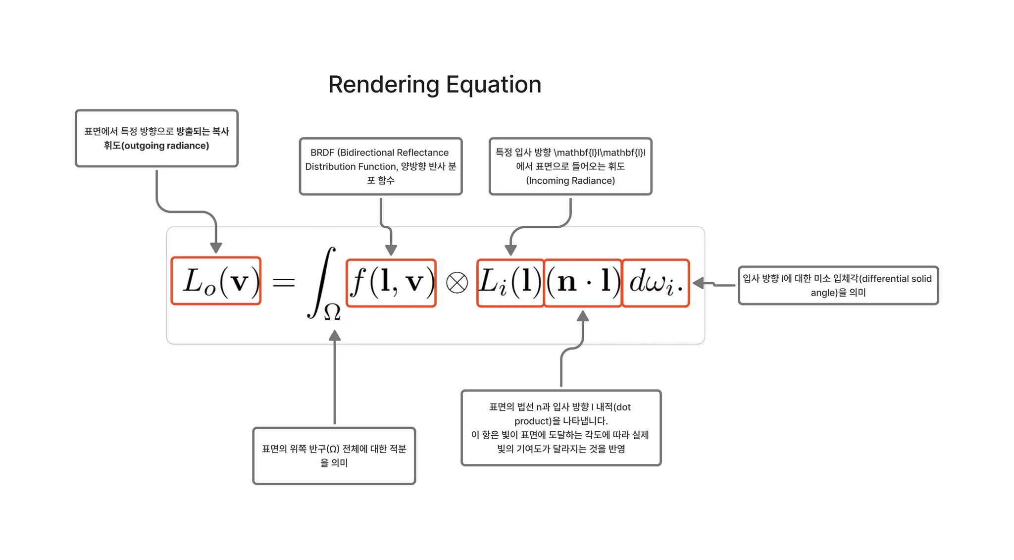 이 방정식이 다소 복잡해 보일 수 있지만, 그 의미는 간단합니다. 나가는 방사 휘도는 들어오는 방사 휘도에 BRDF와 코사인 항을 곱한 것의 (표면 위 모든 방향에 대한) 적분과 같습니다. 적분에 익숙하지 않다면 일종의 연속 가중 평균으로 생각할 수 있습니다. 기호는 성분별 벡터 곱셈을 나타냅니다. BRDF와 빛의 색상은 모두 분광(RGB) 벡터이기 때문입니다.