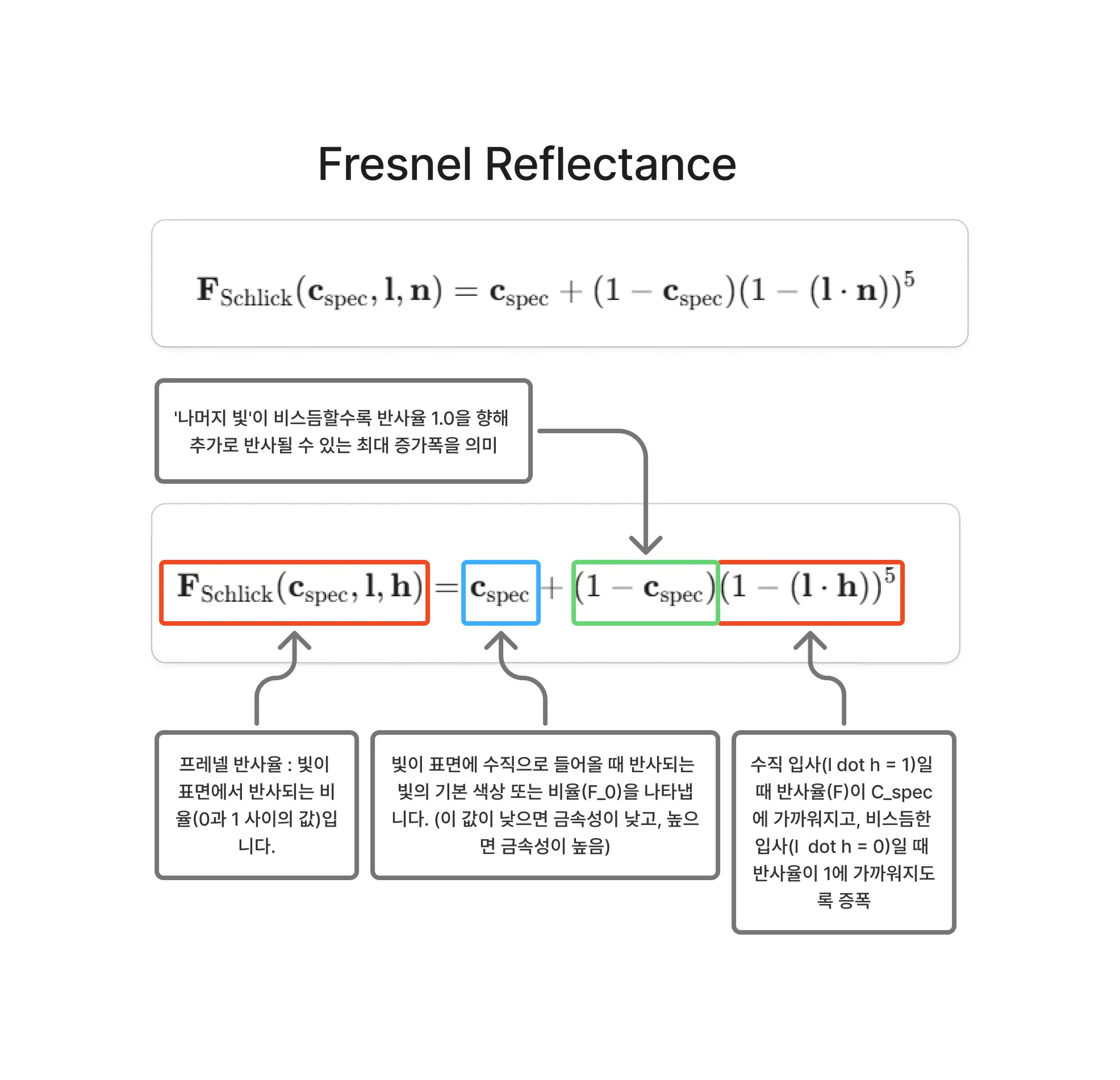 는 활성 미세면들의 프레넬 반사율(Fresnel reflectance)로, 빛의 방향 과 활성 미세면 법선 의 함수입니다. 이는 들어오는 빛 중 각 활성 미세면에서 반사되는 비율을 알려줍니다.