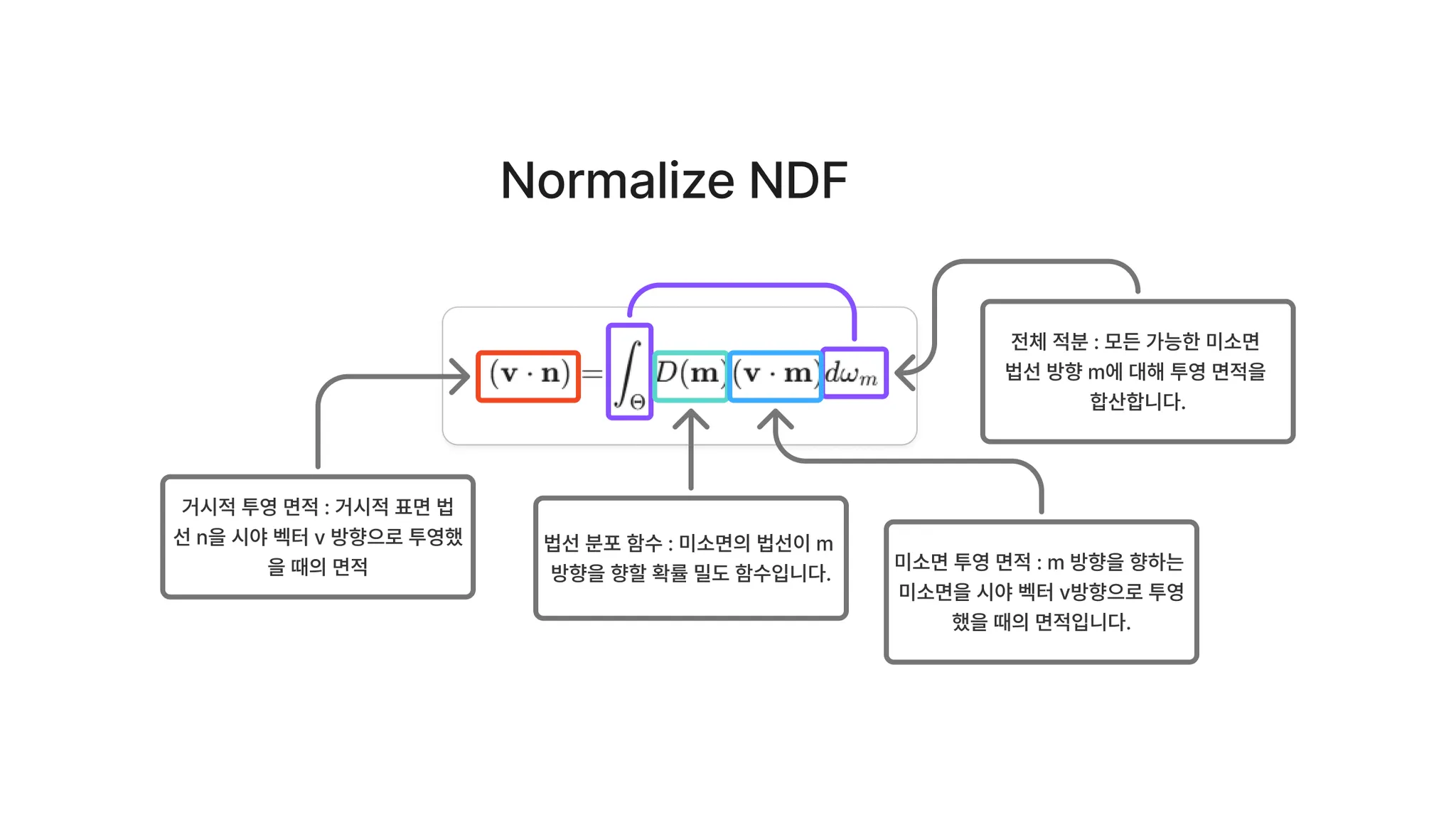 마지막으로, 분모 는 보정 계수(correction factor)입니다. 이는 미세면의 로컬 공간과 전체 매크로 표면(macrosurface) 공간 사이에서 변환되는 물리량들을 설명합니다.