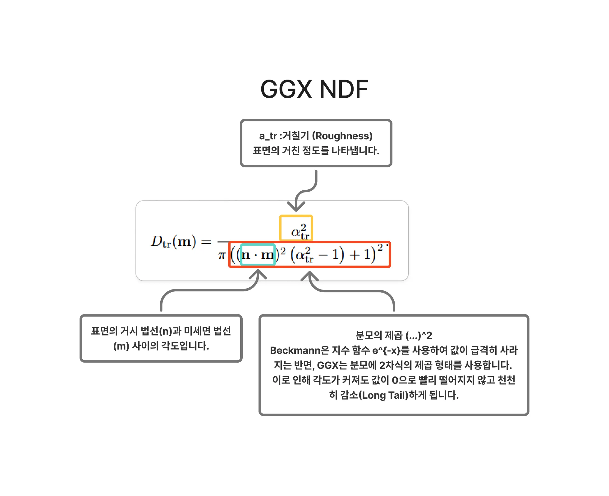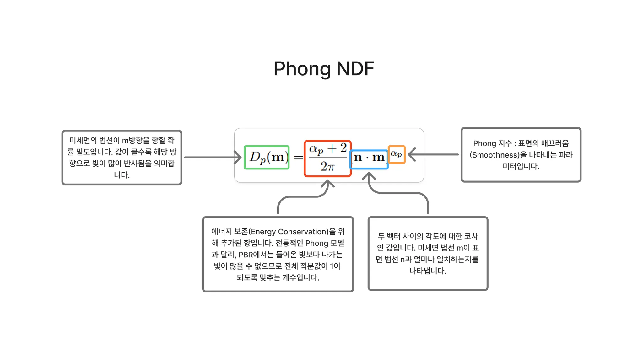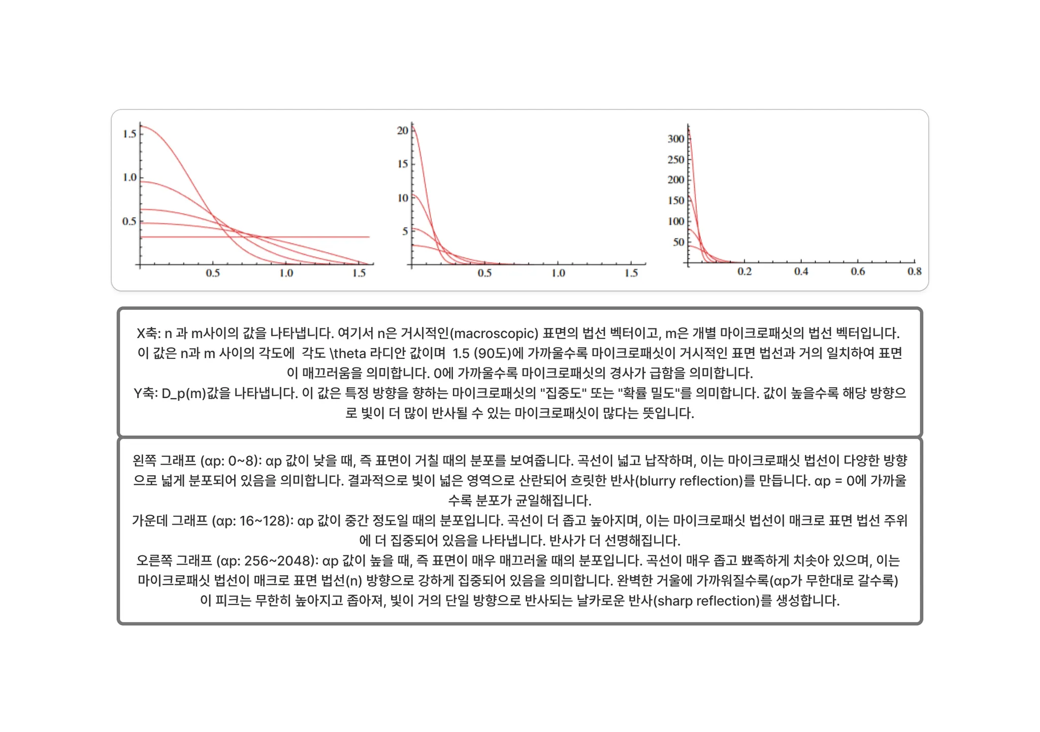 는 하프 벡터 에서 평가된 미세면 법선 분포 함수(microfacet normal distribution function)입니다. 즉, 빛을 에서 로 반사할 수 있도록 배향된 미세면들의 밀도(concentration)입니다.