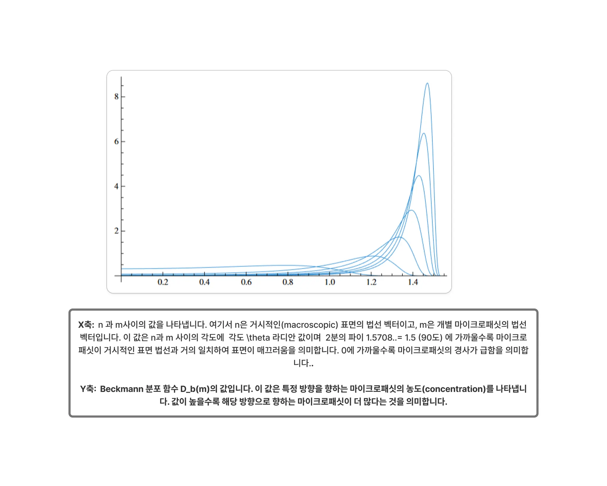 x축: 각도 (라디안) - n(Normal)과 h(m)-mircofacet 사이의 각도