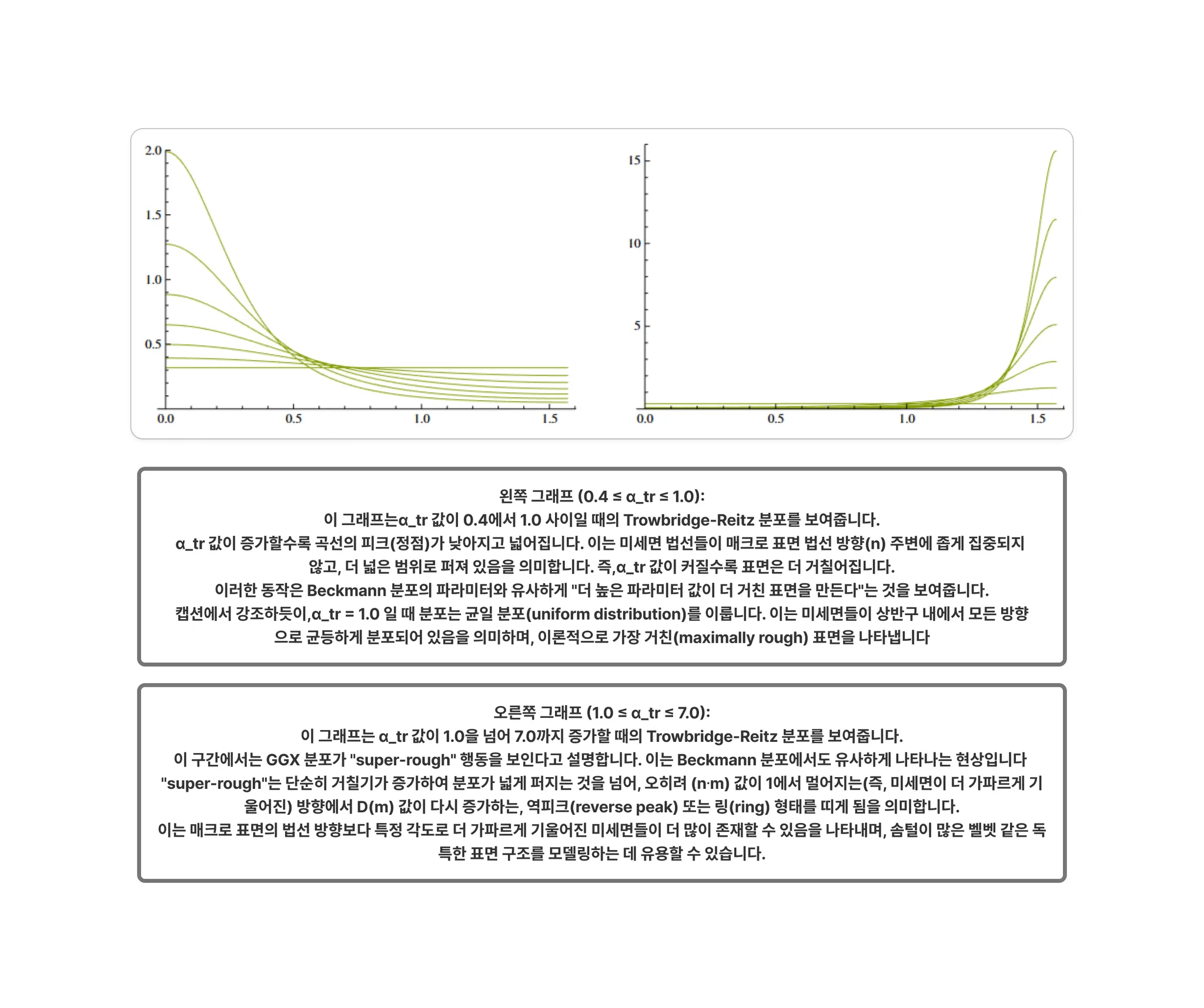 베크만이 퐁과 강한 유사성을 보이면서 계산 비용이 다소 높다는 점을 고려하면, 이 또한 막다른 길처럼 보일 수 있습니다. 그러나 두 분포 사이에는 서로 다른 매개변수화에서 비롯되는 근본적인 차이가 있습니다. 매개변수는 미세면의 제곱 평균 제곱근(RMS, root mean square) 기울기(slope)와 같습니다. 따라서 를 증가시키는 것은 평균 미세면 기울기를 증가시킨다는 의미입니다. 이는 를 감소시켜 얻는 "무작위성 증가"와는 다른 의미의 "거칠기"입니다. 퐁 분포는 "최대로 거친" 매개변수 값()을 가지며, 이는 미세면 법선이 위쪽 반구 어디든 가리킬 확률이 동일한 균일 분포에 해당합니다. 반면 이에 대응하는 베크만 값()은 특별한 의미가 없습니다.
