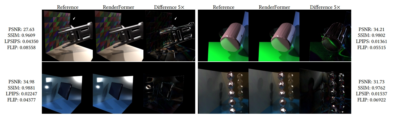 우리는 다양한 장면에서 RenderFormer를 시연해요 (그림 1과 그림 4). 이는 전역 조명 전달의 다양한 측면을 보여주죠. 각 예제마다, Blender Cycles로 픽셀당 4,096 샘플로 계산된 참조 렌더와 5배 확대된 차이 이미지를 보여주고, PSNR, SSIM, LPIPS [Zhang et al. 2018] 및 HDRFLIP [Andersson et al. 2020] 오류를 표시해요. 질적으로 보면, RenderFormer 결과는 시각적으로 비슷하지만 정확히 같지는 않아요. 그럼에도 불구하고, RenderFormer는 그림자, 확산 및 반사 간섭, 광택 반사, 다중 반사 간섭과 같은 많은 중요한 조명 전달 효과를 포함할 수 있어요. 명시적으로 강제하지는 않았지만, RenderFormer는 장면 매개변수의 변화에 안정적이에요.