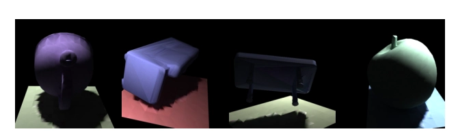 우리는 2백만 개의 합성 장면에서 8백만 개의 HDR 훈련 이미지를 4개의 다른 시점에서 256 x 256 해상도로 렌더링해요 (최대 삼각형 수는 1,536개). 그리고 추가로 8백만 개의 HDR 훈련 이미지를 512 x 512 해상도로, 최대 삼각형 수 4,096개로 렌더링해요. Blender Cycles를 사용해서 픽셀당 4,096 샘플로 (adaptive sampling과 denoising을 사용해) 렌더링합니다.