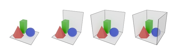 훈련 데이터. 우리 훈련 세트는 Objaverse 데이터셋 [Deitke et al. 2023]에서 무작위로 선택된 1~3개의 객체로 구성된 합성 장면으로 이루어져 있어요. 이 객체들은 네 가지 템플릿 장면 중 하나에 무작위로 배치되는데요, 이 템플릿 장면은 (무작위로 이동, 회전, 크기 조정된) 바닥, 뒤쪽, 옆쪽 벽의 조합으로 이루어져 있답니다. 카메라는 템플릿 벽에 의해 시야가 가려지지 않도록 장면 밖에 배치되고, 시야각(FOV)은 30°에서 60° 사이에서 균일하게 샘플링돼요. 카메라는 중심을 향해 조준되지만, 항상 정확한 중심을 겨냥하지 않도록 약간의 변동을 줍니다.