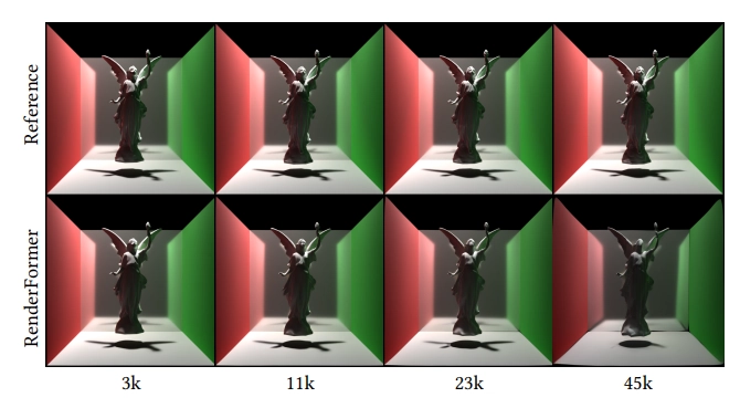 그림 12. RenderFormer는 훈련된 것보다 더 많은 삼각형이 있는 장면도 처리할 수 있지만, 세부 사항과 얇은 특징이 손실될 수 있어요.