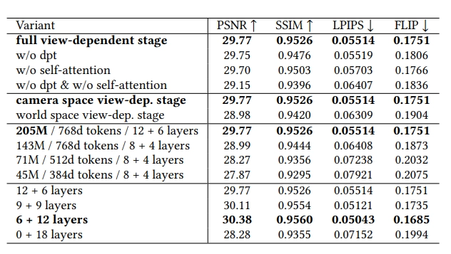 표 1. 다양한 모델 변형 및 아키텍처에 대한 ablation 연구. 계산 제약으로 인해 모든 ablation 연구는 256×256 해상도에서 수행됩니다. 레이어 구성은 #view-independent + #view-dependent layers로 표시됩니다.
