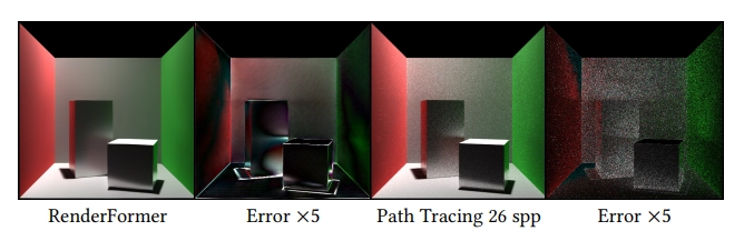 그림 5. RenderFormer와 Blender Cycles를 비교한 결과예요. 여기서는 (비적응형) 26 샘플러-퍼-픽셀을 사용하고, 노이즈 제거는 하지 않았어요.