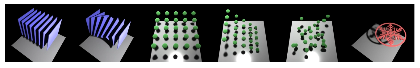 장면 복잡도. 마지막으로, RenderFormer가 장면의 복잡도에 대해 얼마나 정확한지 탐구해 봤어요. 특히, RenderFormer가 복잡한 가리개와 여러 개의 반사 처리를 잘 할 수 있는지 조사했답니다. 그림 14는 가리개의 복잡도가 증가하는 장면을 보여줘요. 첫 두 열은 서로 가까이 붙어 있는 평면들이 바닥과 평면 사이에 그림자를 드리우는 모습을 보여줍니다. 그림 14의 세 번째부터 다섯 번째 열은 바닥 평면과 광원 사이에 다양한 거리로 배치된 작은 가리개들을 보여줘요. 복잡한 모양의 가리개 그림자가 때때로 세부 사항을 놓치는 것을 관찰할 수 있었어요 (그림 14, 세 번째부터 다섯 번째 열).