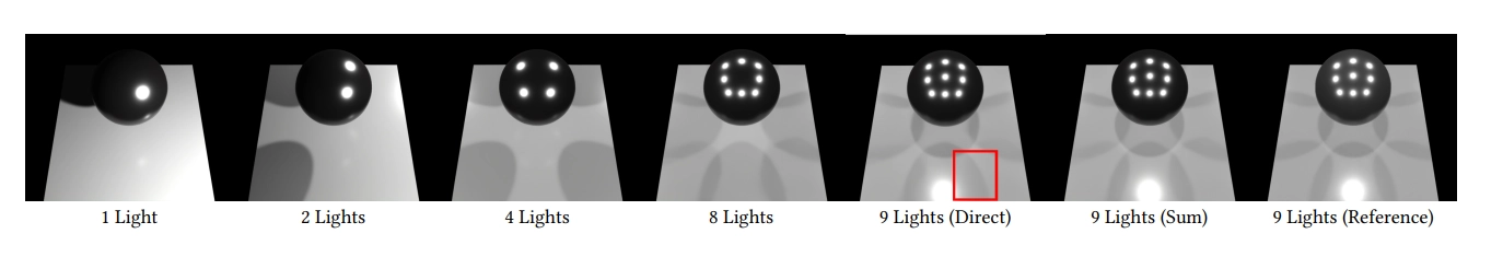 그림 10. RenderFormer는 최대 8개의 조명까지는 정확한 반사와 그림자를 처리할 수 있어요 (1번째부터 4번째 열까지). 훈련 시에 본 조명 수를 초과하면, 하이라이트나 그림자가 누락될 수 있어요 (예: 5번째 열의 아래쪽 그림자에서 누락된 이중 그림자). 이런 경우, 여러 개의 단일 조명 이미지를 합성하여 올바른 결과를 계산할 수 있답니다 (6번째 열).