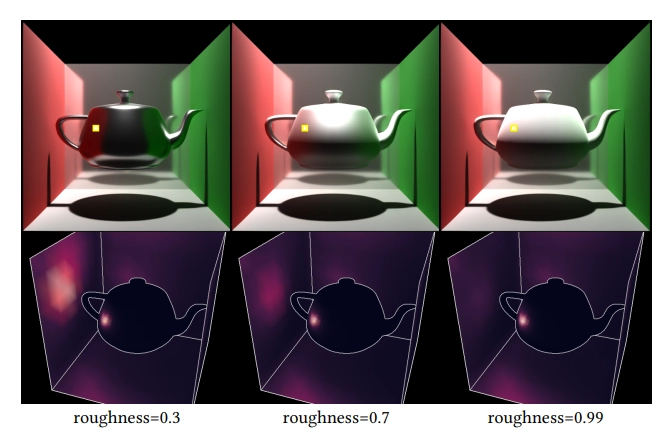 레지스터 토큰이 중요한 정보를 포함할 수 있기 때문에, 각 삼각형 토큰과 16개의 레지스터 토큰 사이에 cross-attention layer도 포함시켰어요. MLP와 cross-attention layer를 훈련하는 동안, view-independent 단계는 고정된 상태로 두고, 단순한 단색의 diffuse 장면을 약 500개 정도의 작은 배치로 훈련해요. MLP는 의도적으로 얕게 설계되어, 토큰에 내재된 정보를 직접 시각화하는 간단한 작업만 수행하도록 제한했어요. 그림 7은 view-independent 단계가 삼각형 간의 diffuse light transport와 그림자의 상당 부분을 해결하는 것을 보여줘요. view-dependent 단계는 삼각형 토큰에서 정보를 모아 각 픽셀의 관측된 방사휘도를 계산해요. 그림 8에서는 선택된 ray-bundles에 대해 적절한 시점에서 시각화된 삼각형에 투영된 attention 가중치의 합을 시각화했어요. 이 시각화는 주어진 ray-bundle에 대해 최종 방사휘도에 각 삼각형이 얼마나 기여하는지를 보여줘요. 그림 8에서 직접 보이는 삼각형과 반사 방향 주변의 삼각형에 주요 가중치가 놓여 있는 것을 볼 수 있어요. 또한, 재질의 거칠기를 증가시킬 때 가중치 분포가 어떻게 변하는지도 볼 수 있답니다.