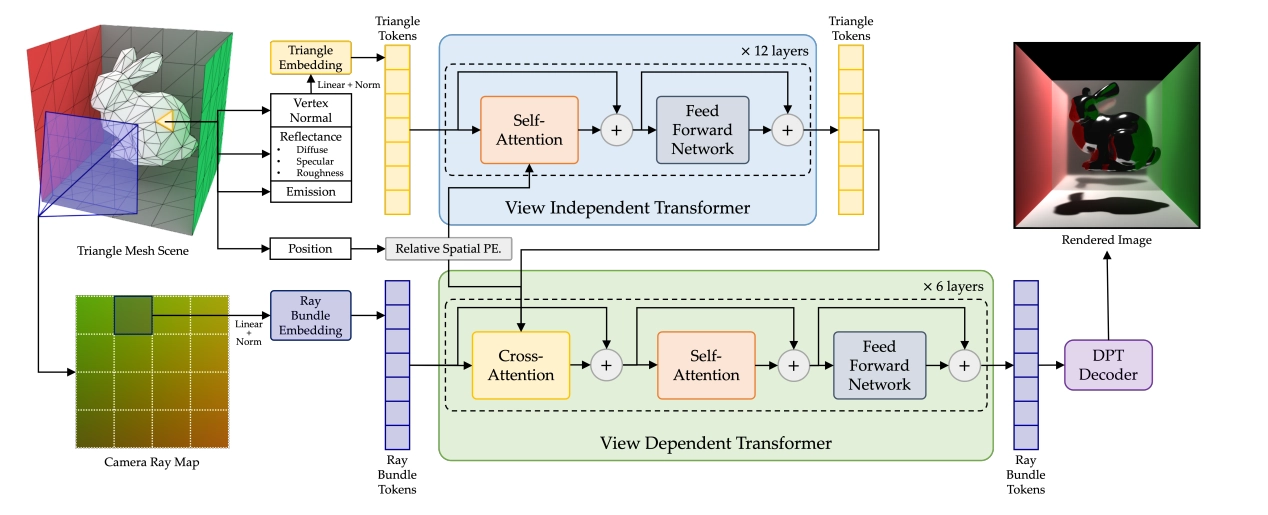 그림 2. RenderFormer 아키텍처 개요. 위쪽: view-independent 단계는 각 삼각형의 반사 특성을 인코딩한 삼각형 토큰 시퀀스로부터 삼각형 간의 빛 전송을 해결합니다. 각 삼각형의 상대 위치는 별도로 인코딩되어 각 self-attention 레이어에서 각 토큰에 적용됩니다. 아래쪽: view-dependent 단계는 가상 카메라 위치를 ray-bundle 시퀀스로 인코딩하여 입력으로 받습니다. cross-attention 레이어를 통해 view-independent 단계의 삼각형 토큰의 안내를 받아, ray-bundle 토큰은 각 view ray의 outgoing radiance를 인코딩하는 토큰으로 변환됩니다. 마지막으로, ray-bundle 토큰은 dense vision transformer를 통해 log-encoded HDR radiance 값으로 변환됩니다.