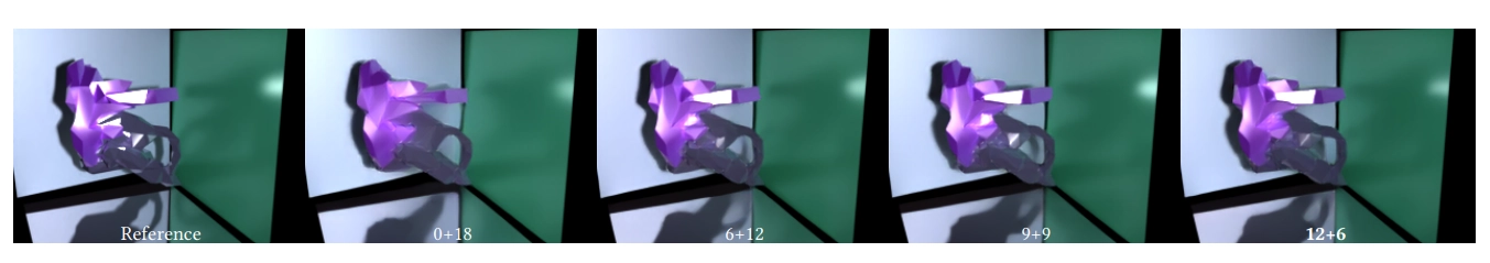 그림 6. 각 단계별로 view-independent와 view-dependent attention 레이어 수를 변화시킨 질적 비교. RenderFormer는 마지막 열에 12개의 view-independent 레이어와 6개의 view-dependent 레이어 비율로 표시되어 있습니다.