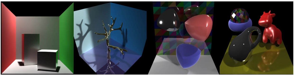 그림 1. RenderFormer를 사용하여 장면별 학습이나 미세 조정 없이 렌더링된 삼각형 메쉬 기반 장면의 예시입니다. 여기에는 (다중) specular reflection, 삼각형보다 세밀한 복잡한 그림자, diffuse indirect lighting, glossy reflection, 부드러운 그림자와 강한 그림자, 다중 광원 등이 포함됩니다.