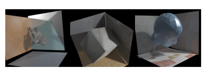 그림 14. RenderFormer는 많은 객체가 있는 장면에서 가려짐을 정확하게 재현할 수 있어요. 하지만, 매우 복잡한 형태의 가리개가 드리우는 그림자는 그림자 세부 사항의 손실을 초래할 수 있답니다.