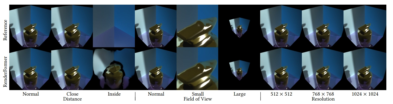 그림 13. RenderFormer는 카메라가 장면 밖에 있는 한, 훈련 중에 본 것보다 더 가까이 이동해도 견고하게 작동해요(2번째 열). 또한, 훈련 중에 본 시야각을 초과해도 견고하게 작동한답니다(4번째-6번째 열). 더 높은 해상도로 렌더링할 때도 RenderFormer는 우아하게 실패하는데요(7번째-9번째 열). 예를 들어, 회색 벽과 파란 벽 사이의 깊이 불연속성 주변에서 차이가 발생해요.