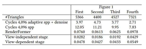표 2. RenderFormer와 Blender Cycles의 시간 비교입니다. 각 픽셀당 4,096 샘플을 사용하여 훈련 데이터 생성 설정과 일치시켰어요. 적응형 샘플링과 노이즈 제거를 포함한 시간과 포함하지 않은 시간을 모두 포함했어요. 또한, 뷰 독립적 단계와 뷰 의존적 단계에서 소요된 시간을 세분화해서 제공해요. 시간은 사전 캐시된 커널을 사용하여 초 단위로 측정되며, 장면 로딩 비용은 제외됩니다.