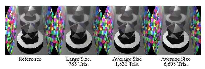 삼각형 메쉬. 현재 훈련 데이터는 삼각형들이 모두 대략 같은 크기로 생성되도록 되어 있어요. 삼각형 크기가 솔루션의 정확도에 영향을 미치는지 더 잘 이해하기 위해, 받침대와 icosphere가 1,318개의 삼각형으로 표현된 장면을 두 번 렌더링하는 실험을 수행했어요 (그림 9).