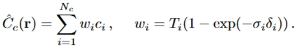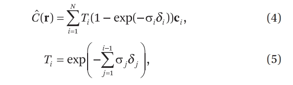 샘플링된 들로부터 를 계산하는 방식은 Max¹⁰의 볼륨 렌더링 정식화와 같은 계열의 구적법으로 유도되며, 결과적으로 전통적인 알파 합성(alpha compositing) 형태로 정리됩니다.