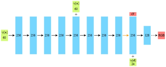 구체적으로 MLP는 입력 3D 좌표 를 먼저 8개의 완전 연결 레이어로 처리하며, 각 레이어는 ReLU 활성화와 256채널을 사용합니다. 이후 네트워크는 밀도 와 256차원의 특징 벡터(feature vector)를 출력합니다. 이 특징 벡터는 시점 방향 와 결합(concatenate)되어, ReLU 활성화와 128채널을 사용하는 추가 완전 연결 레이어를 거친 뒤 최종적으로 시점 의존 RGB 색상 를 출력합니다.