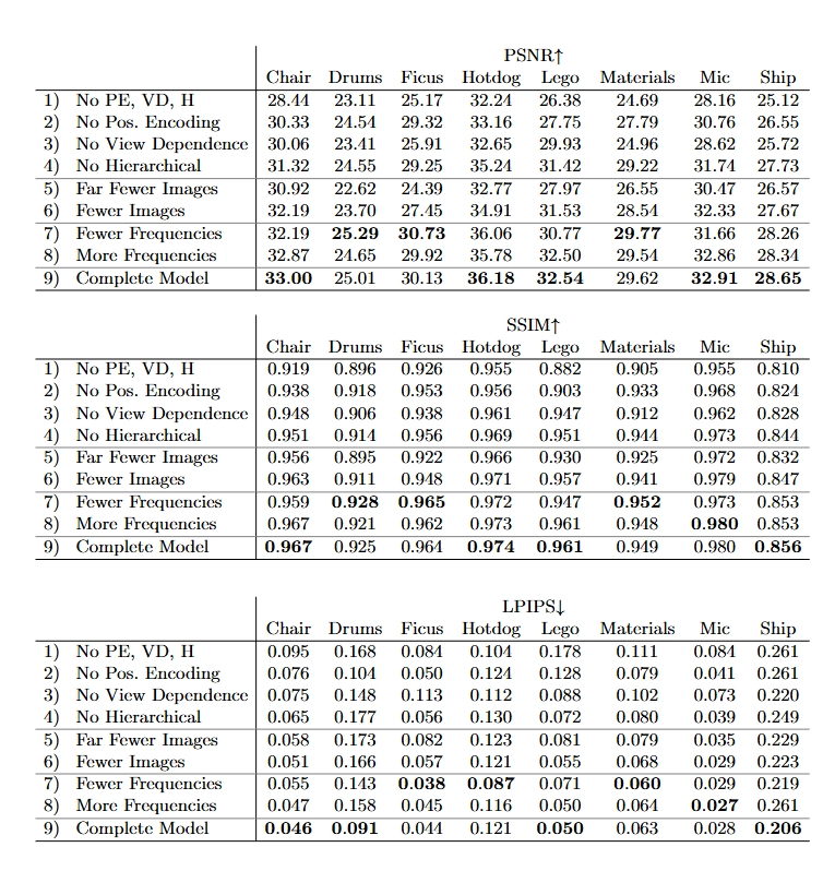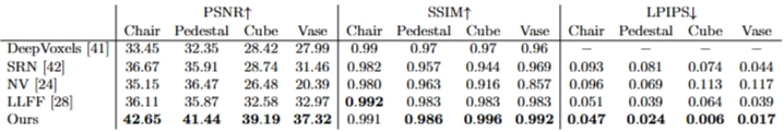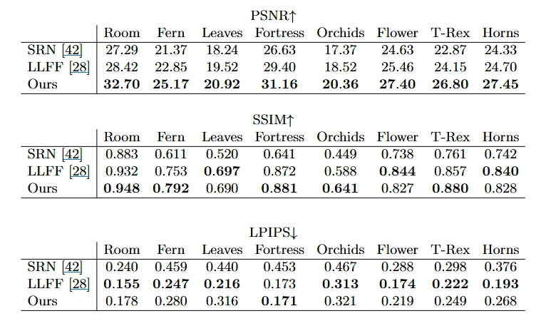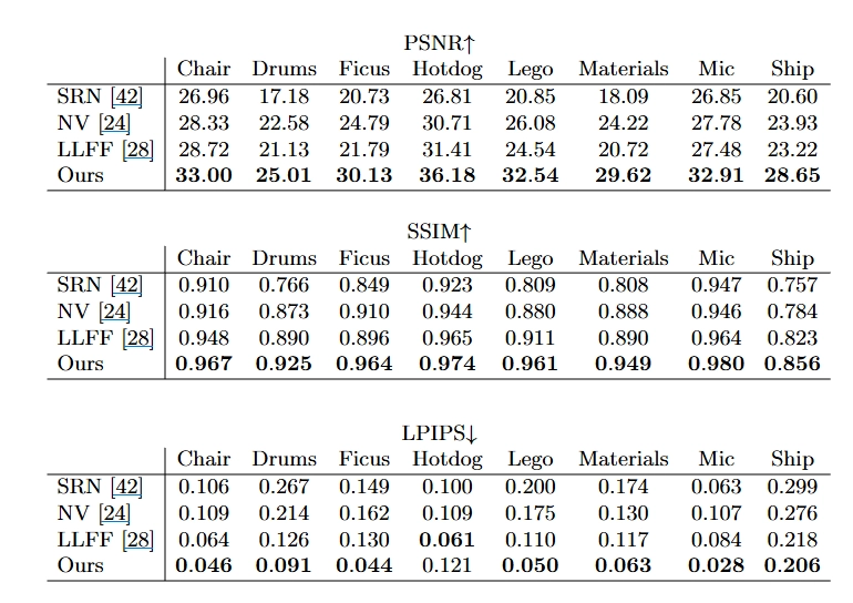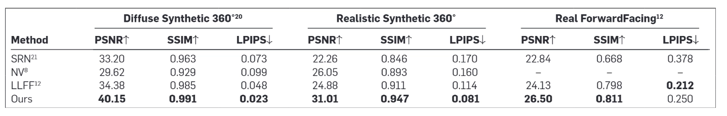 DeepVoxels 방법의 지표들은 해당 논문에서 직접 가져왔으며, LPIPS는 보고하지 않고 SSIM에 대해서만 두 개의 유효 숫자를 보고합니다.