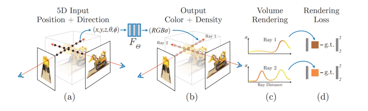 이 출력을 카메라 광선(ray)을 따라 반복적으로 질의(query)하고, 고전적인 볼륨 렌더링(volume rendering) 적분으로 픽셀 색을 합성합니다. 이 렌더링 과정은 자연스럽게 미분 가능(differentiable) 하므로, 카메라 포즈가 알려진 이미지 집합만으로도 관측 이미지와 렌더링 이미지의 오차를 최소화하는 방식으로 장면 표현을 직접 최적화할 수 있습니다.